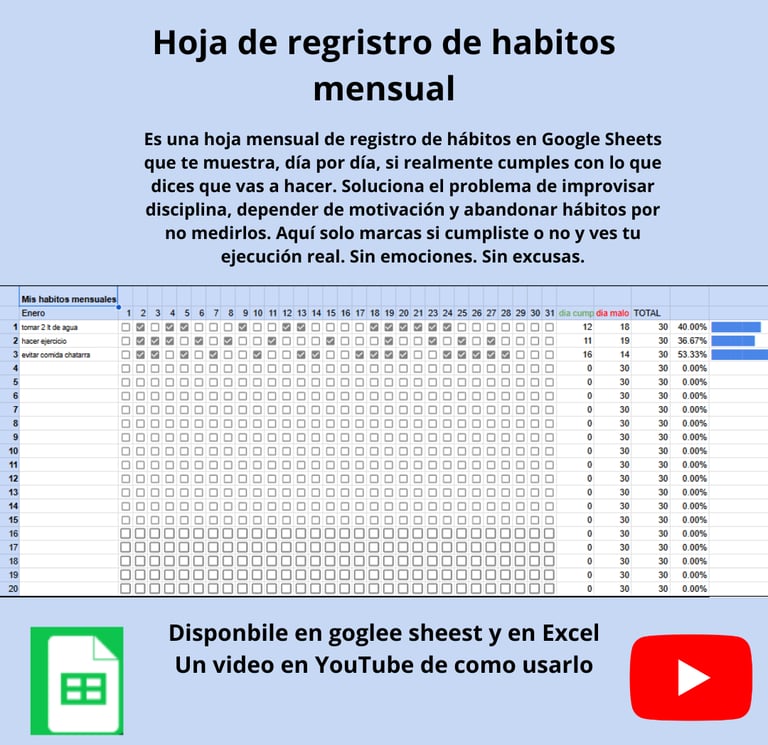 En 30 días tendrás un registro diario claro y automático de tus hábitos y sabrás, sin excusas, Para cumplir tus objetivos.